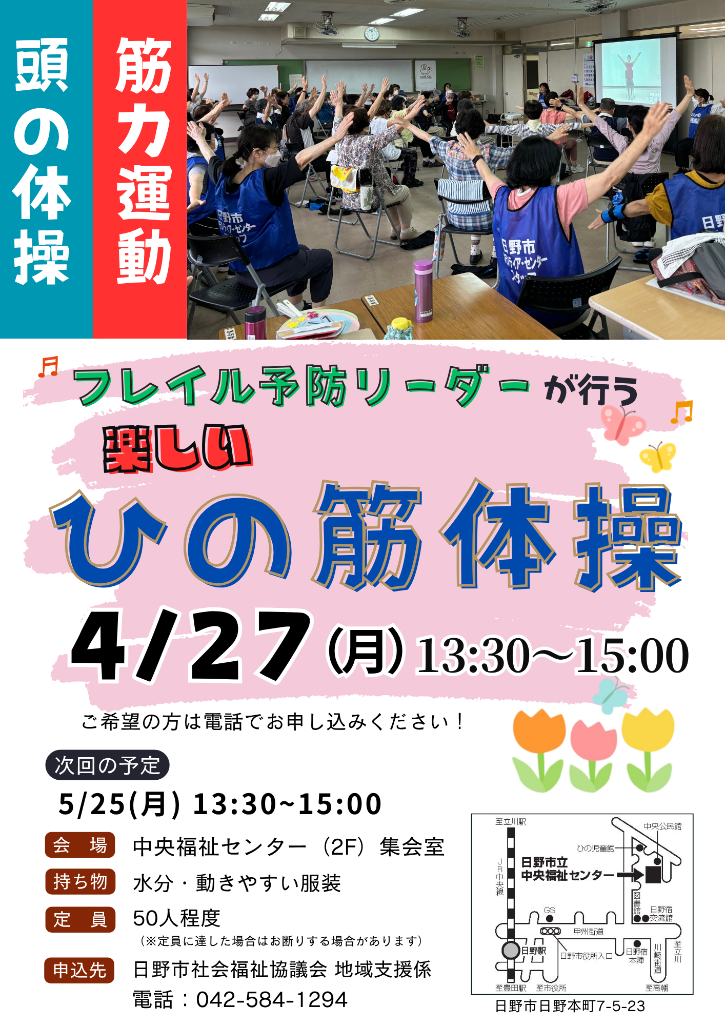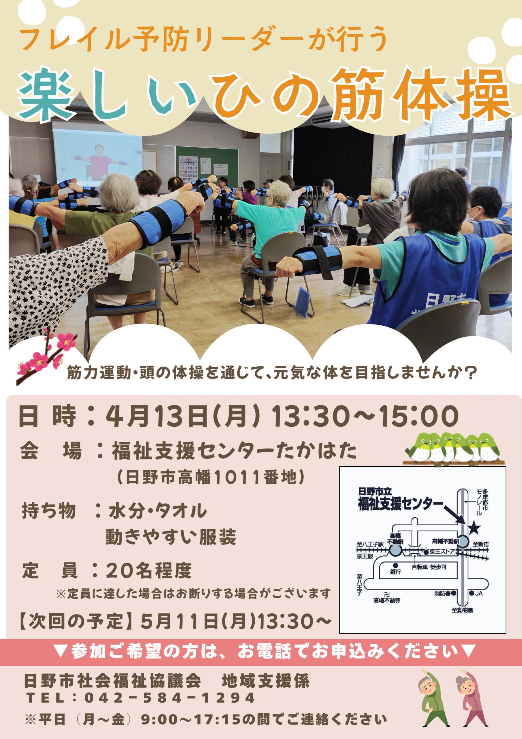 「ひの健幸貯筋体操(筋力体操)」で、みんなで楽しくフレイル予防(運動・社会参加・栄養)に取り組みましょう!